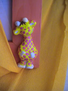 Tem escrito o nome dela em biscuit que a seguir pintei e acrescentei um anjinho, um elefantezinho cor de rosa e uma girafa amarelas com pintas cor de rosa.